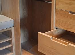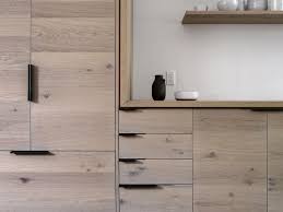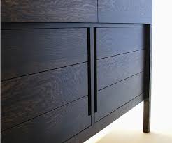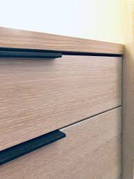 To get this flush look the cabinet fronts are routed out and the pull is recessed inside. These recessed rectangular pulls from doug mockett create a finger channel within the rectangle. They work best either in one consistent width or sized to match each cabinet.