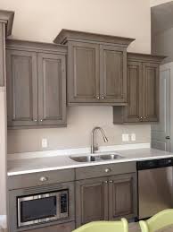 Glazed finish grey kitchen cabinet. The color of these kitchen cabinets is lunar grey and it works so well with brass hardware. When using gray in your kitchen its important to have adequate lighting.