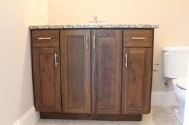 Poplar cabinets. It can be stained but needs a conditioner just like any soft wood. If the budget for a cabinetry run is low but the space calls for a dark hardwood appearance then considering poplar would be an excellent alternative choice. It should be noted that poplar might not be the easiest species to work with for cabinet doors.