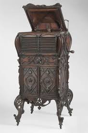 Circa 1919 oak case with decorated corners. Information on the various evolving cabinet and horn types hardware controls etc. Cranks and turntable spins fine.